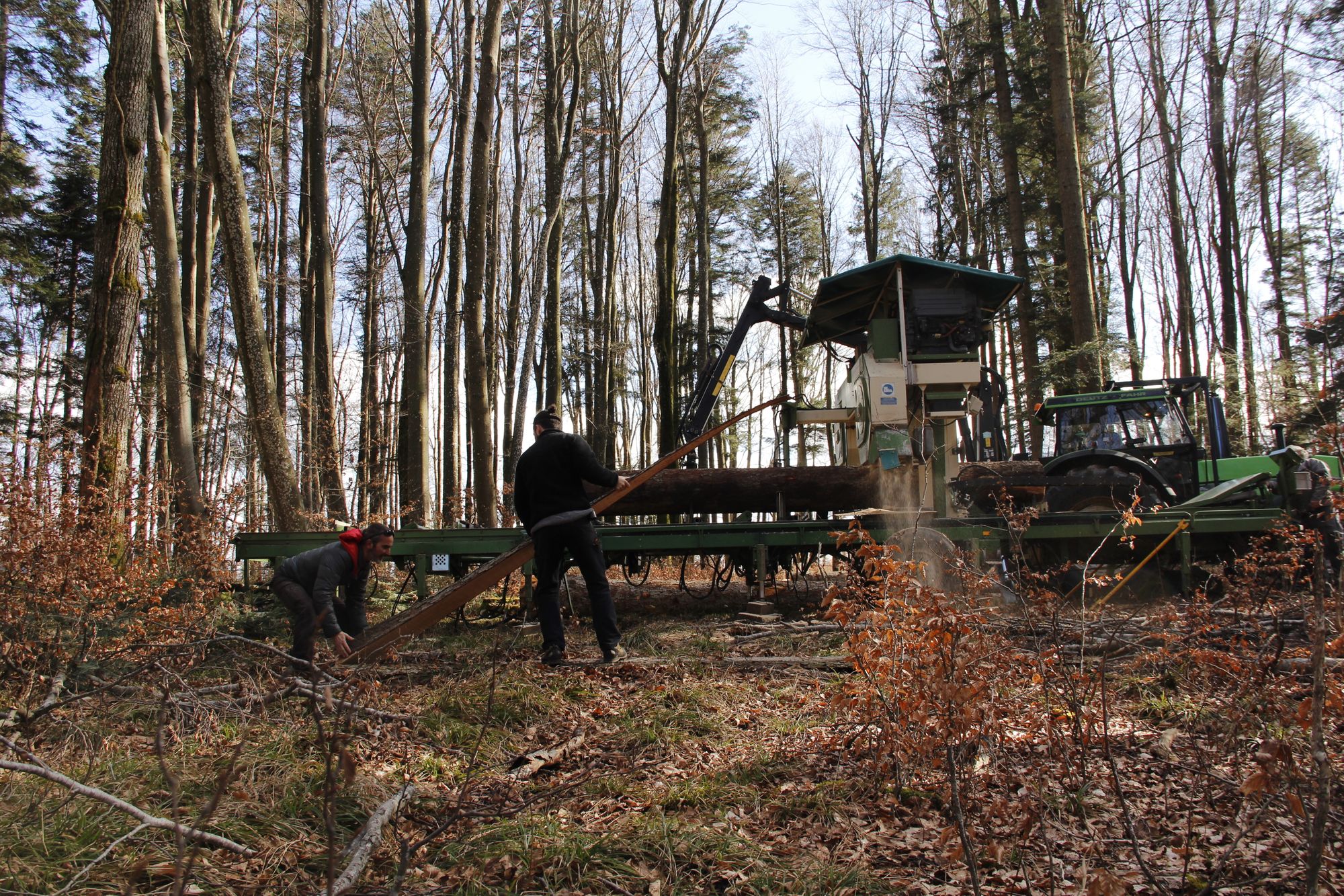 Ein mobiles Sägewerk fährt direkt in den Wald. Dort wird die Maschine aufgestellt und die Baumstämme zu Brettern und Balken gesägt.